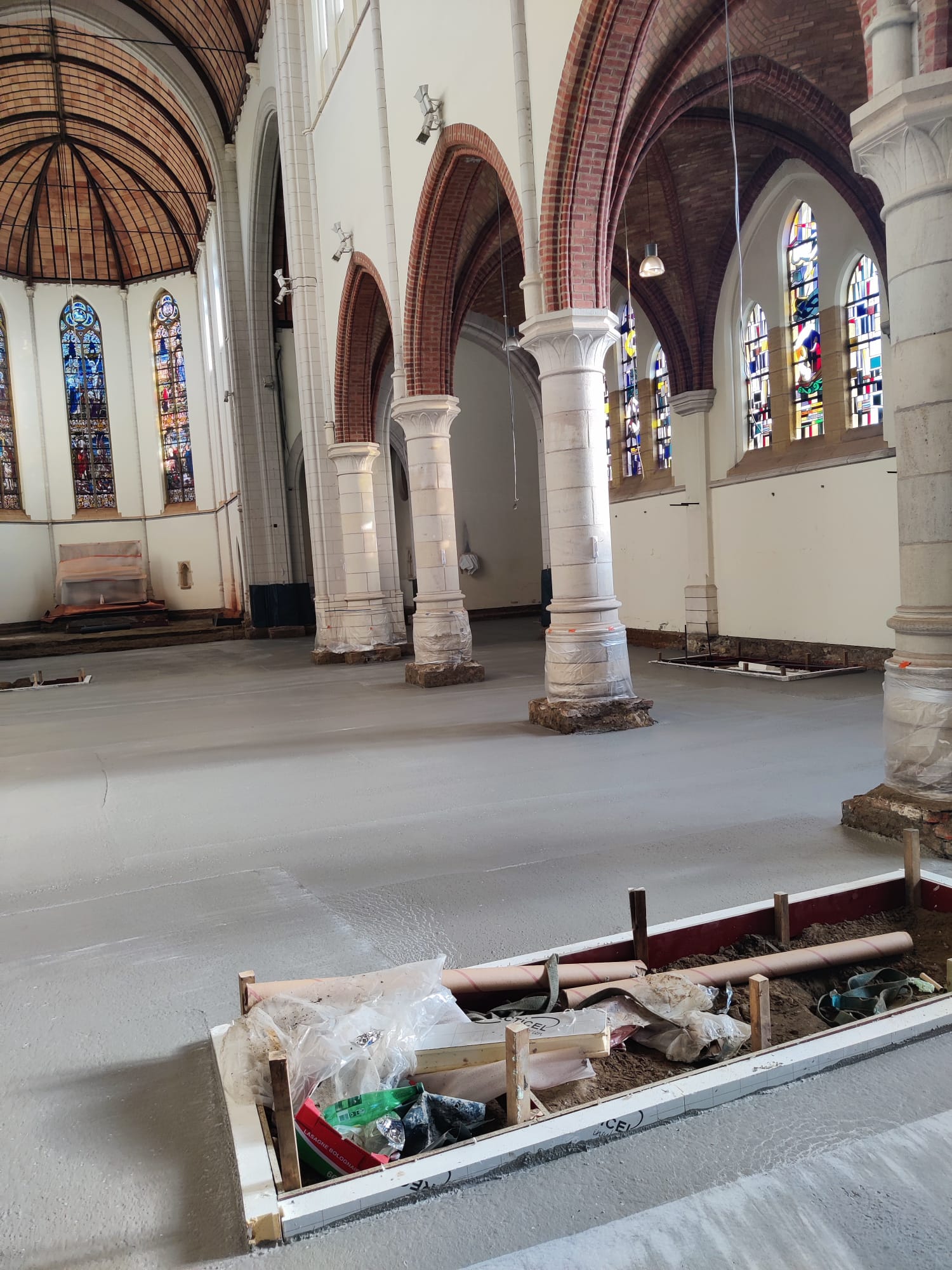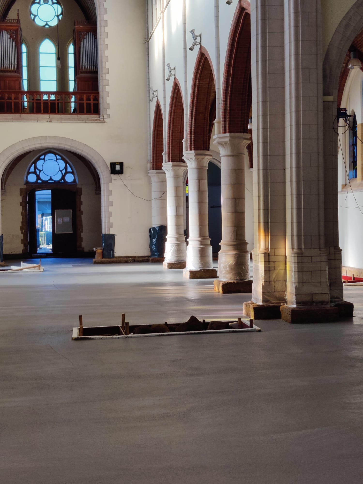 De vloer is uitgebroken en daarbij zijn resten van twee oudere kerken ontdekt. Er is dus wat opgravingswerk gebeurd.